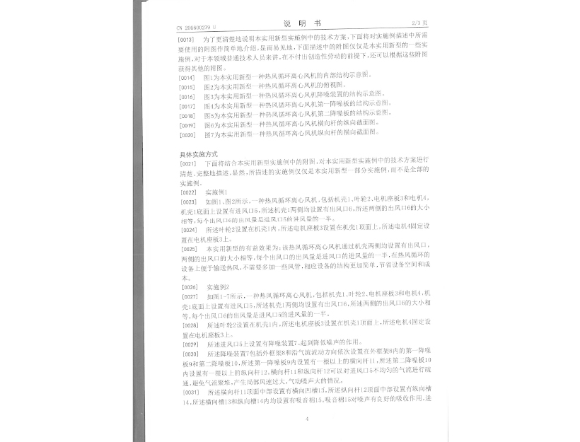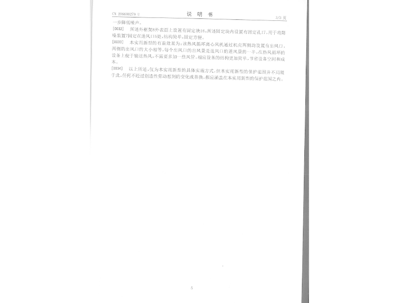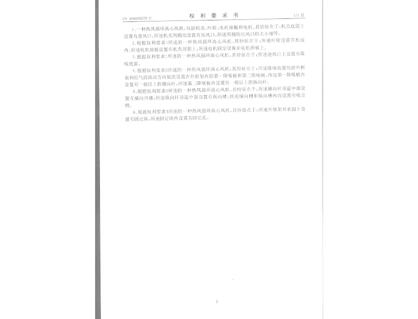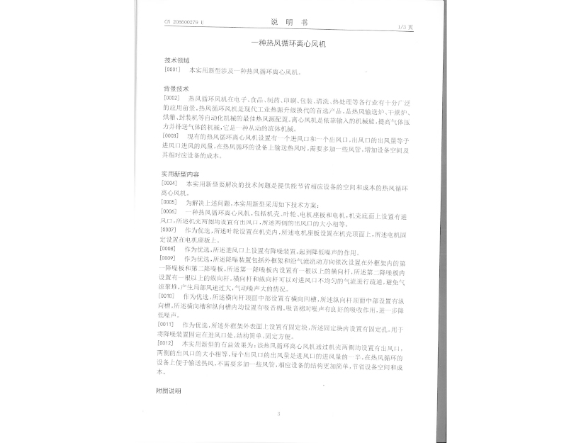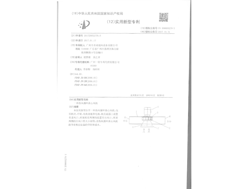 實用新型專利證書 一種熱風(fēng)循環(huán)離心風(fēng)機